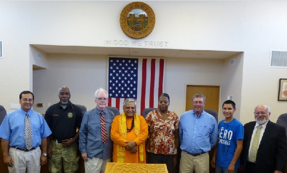 Just before the Dos Palos City Council Hindu invocation, from left to right, are— CEO Darrell Fonseca, Police Chief Barry Mann, Councilmember Michael Mc Glynn, Hindu statesman Rajan Zed, Councilmember Alice Thompson, Councilmember John Gamboni, City Clerk Andrew Montez and City Attorney Edward Amaral.