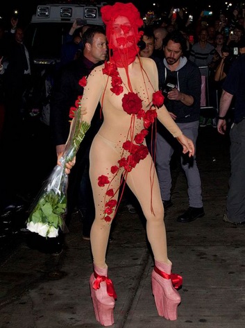 The outfit was completely see-through, but red roses were strategically placed to cover her private parts.