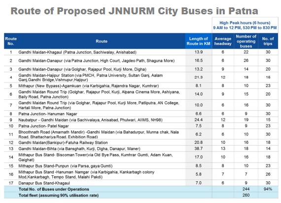 The Funds were sanctioned by Central Government under the JNNURM for procurement of buses for Patna and Bodh Gaya in 2009 little progress was made that time. Proposals are on to run JNNURM city service buses in the 11 municipal corporation areas of Bihar.
