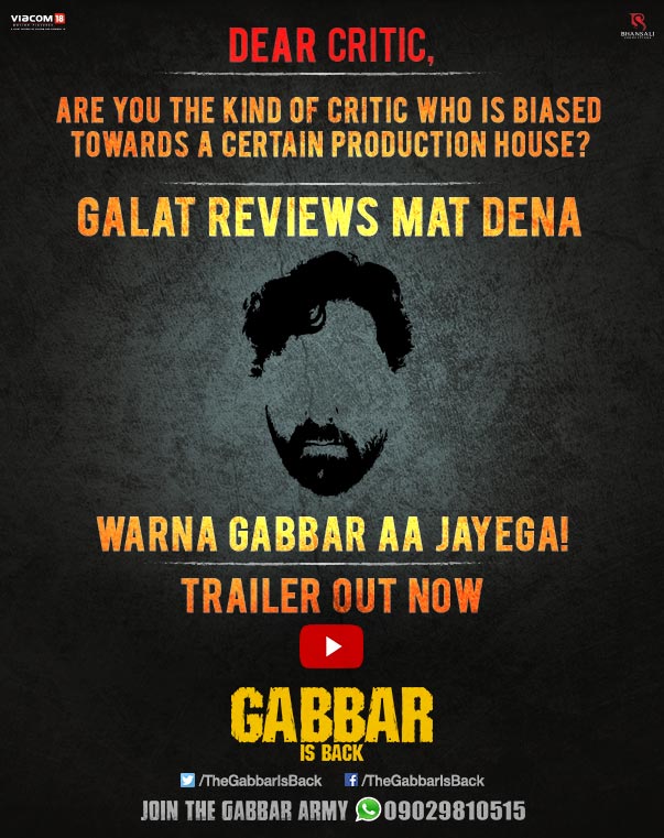 The Theatrical Trailer of upcoming Bollywood Movie Gabbar is Back was released few days back. The Movie is directed by Krish and produced by Sanjay Leela Bhansali and Viacom 18 Motion Pictures. It features, Akshay Kumar, Shruti Haasan, Prakash Raj, Sonu Sood and Nikitin Dheer in lead roles. The Trailer has received mixed reviews from the critics. However the thing which interested me most was the threat from it’s PR Team. A poster was sent to us telling if the critics did not give positive reviews, then Gabbar aa Jayega. Dear PR Team, we are waiting for Gabbar to come back 🙂