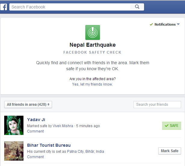 Social Networking Site Facebook has launched Safety Check Tool for the people present in the affected areas of 2015 Indian Subcontinent Earthquake which claimed over 1000 lives while injuring over 2000 people mostly in Nepal, followed by India. The Safety Check tool can be accessed at below URL