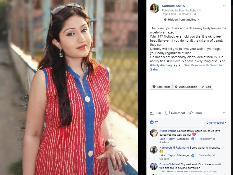 Soumita has been tirelessly campaigning against this mental state of society which reduces woman to mere objects, which is often body shamed, abuse and violated due to a plethora of reasons. She has used her social media fan following, her music videos to end this discrimination. In past one week, she has been effortlessly raising the cause of every form of abuse and violence against women.