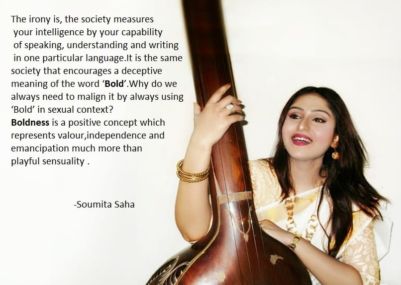 Soumita had, in past posted “The irony is that the society measures your intelligence by your capability of speaking, understanding and writing one particular language. It is the same society that encourages a deceptive meaning of the word ‘Bold’. Why do we always need to malign it by always using ‘Bold’ in sexual context? Boldness is a positive concept which represents valor, independence and emancipation much more than playful sensuality.â€
